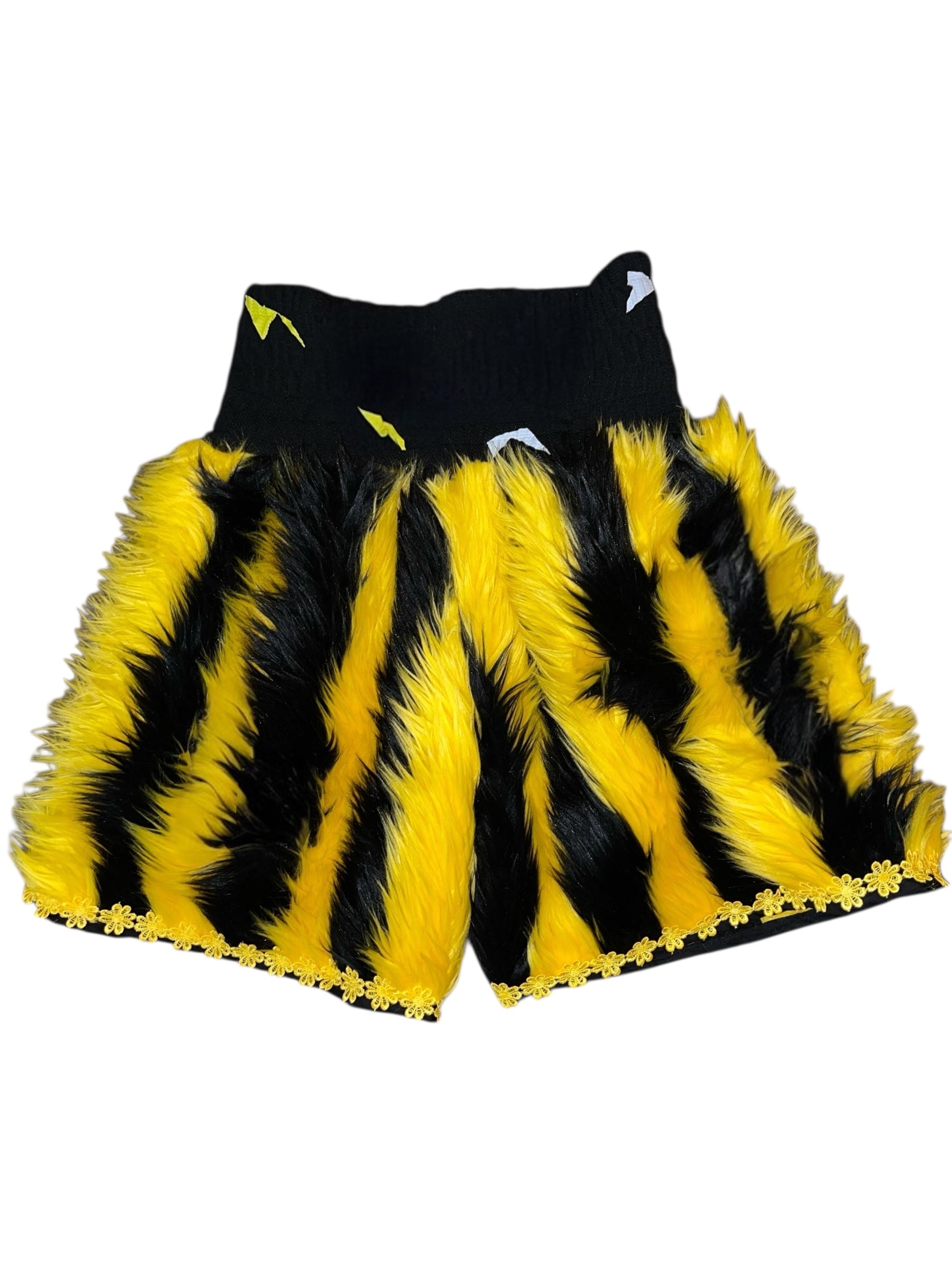 Indulge in luxury with our Bumble Bee trunks. Crafted with 6" of soft faux fur, the black and yellow design is accented with a sunflower trim and a thunder bolt waistband. Channel your inner superhero and embrace your elegance and power with every wear.
