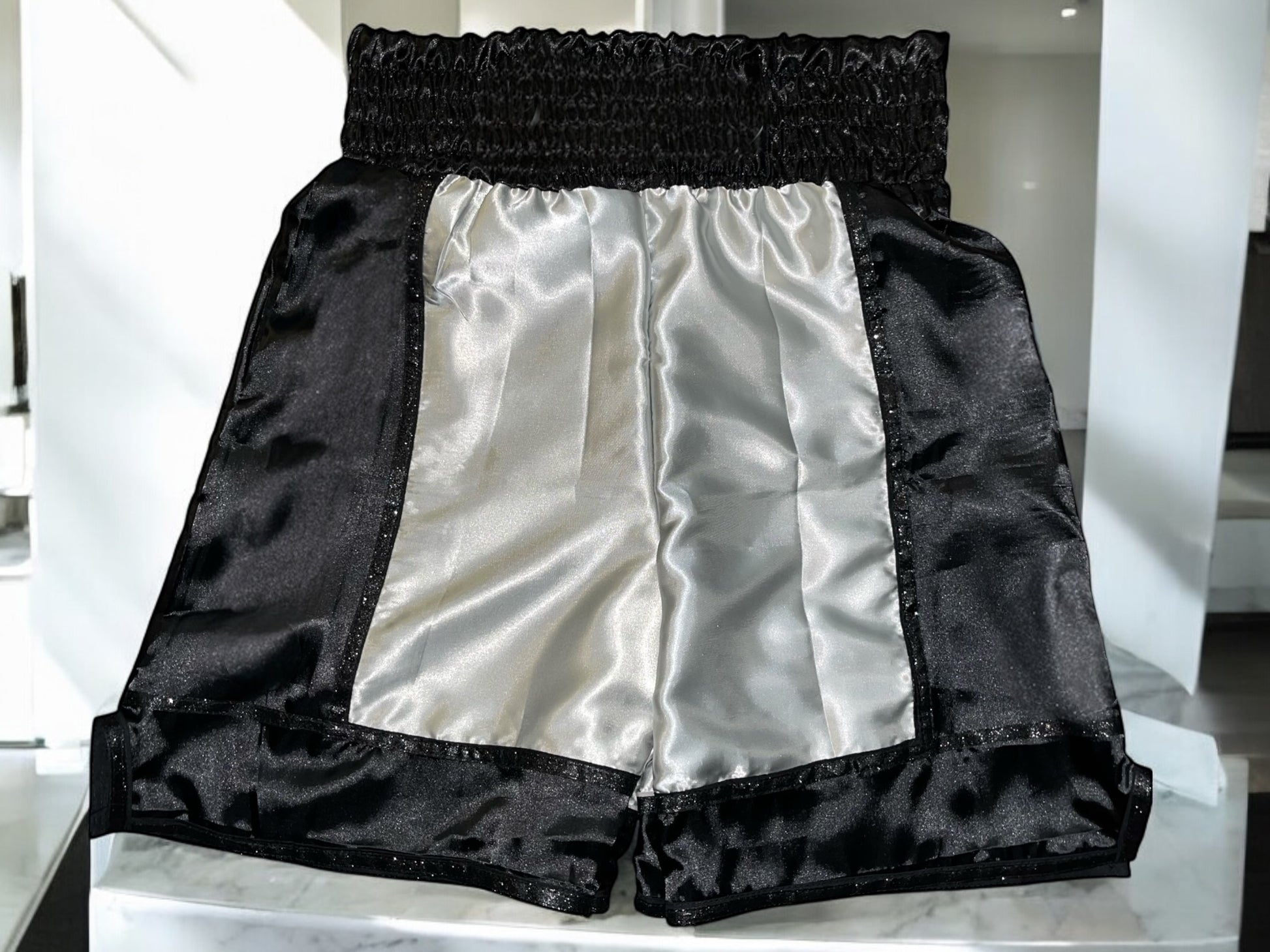 Indulge in the opulence of our Glitter Trim Trunks. Crafted from 100% polyester, these two-color boxing shorts feature a dazzling black trim that will make you stand out in the ring. Elevate your performance and style with these luxurious trunks.