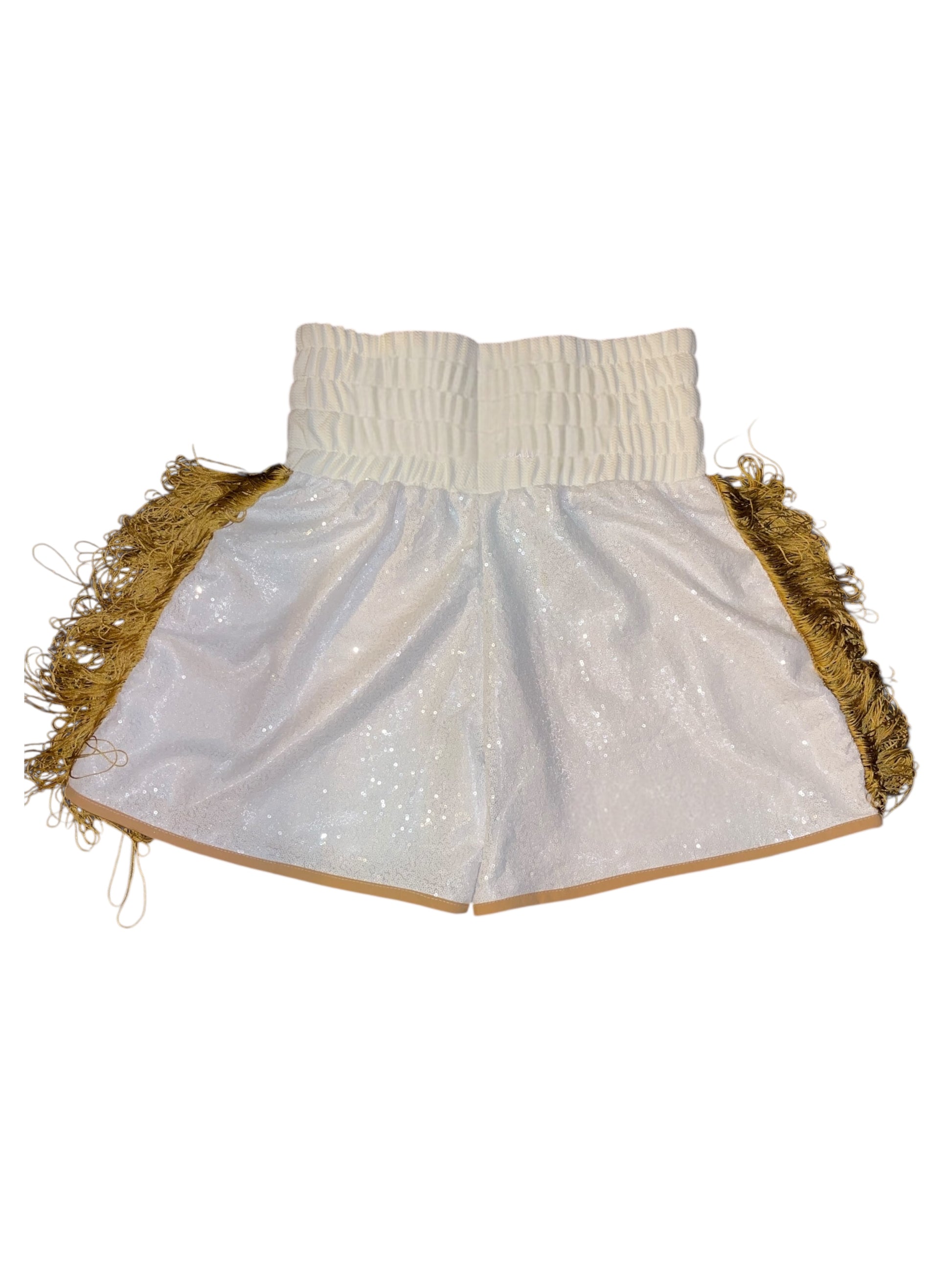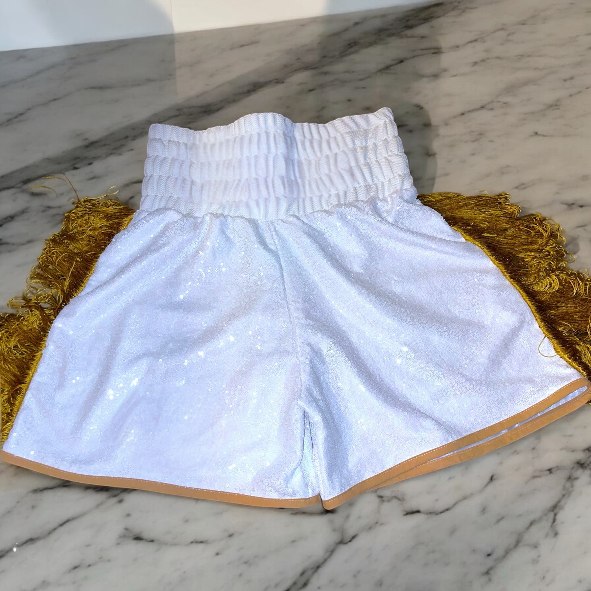 The Glory Days Sequin Trunks are elegant, luxurious wide-legged boxing shorts that blend classic style with modern sophistication. Featuring shimmering sequins, these shorts offer a striking, refined appearance while providing a comfortable, roomy fit ideal for movement. Perfect for those seeking a bold yet graceful statement in their athletic wardrobe, they combine luxury and functionality with effortless charm.
