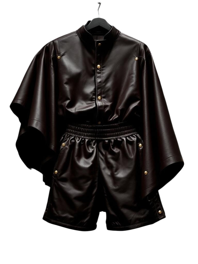 Indulge in the opulent luxury of our 4 inch waistband. Experience the unparalleled elegance of our all-leather dark brown poncho, complete with matching shorts adorned with delicate gold button embellishments. Treat yourself to the utmost sophistication and style with this exquisite set.